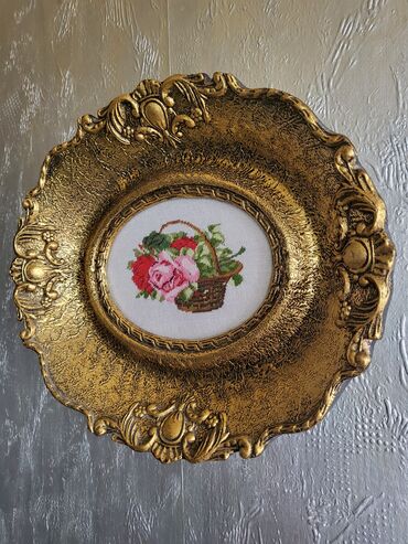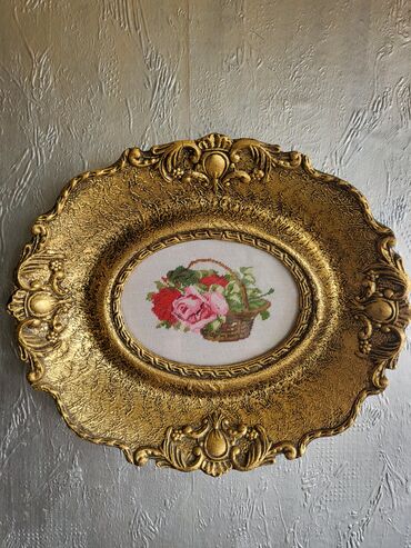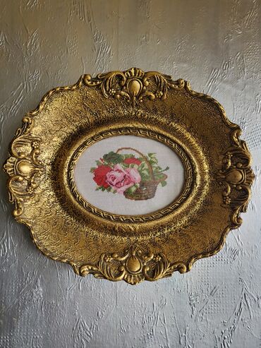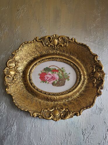 Dekorativni zidni tanjir/okvir sa goblenom - Okrugli ukrasni tanjir sa centralnim ovalnim okvirom - Materijal: imitacija drveta sa reljefnim baroknim detaljima u zlatnoj boji - Centralni deo: ručn...