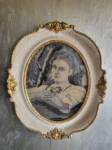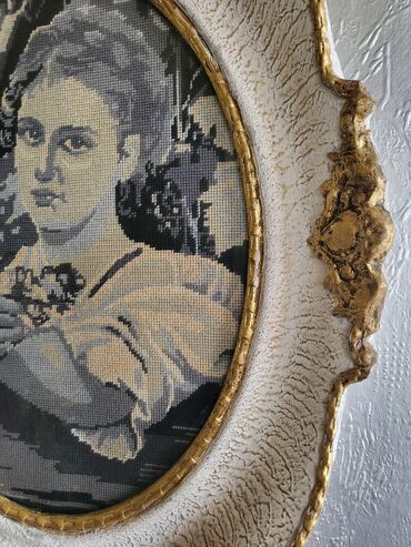Ručni radovi u okviru – kolekcija goblena sa zlatnim ukrasnim ramovima - Gobleni rađeni krstom, šarena i jasna kompozicija. Motivi: devojčica sa cvećem na tamnoj podlozi, devojčica uz ogradu i fig...