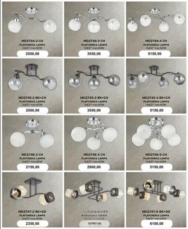 Jačina: Max. 60W Tip grla: 3xE27 Napon: 220-240V / 50-60Hz Boja: Hrom Materijal: Metal + Staklo Dimenzije: v: 230mm Ø430mm Stepen zaštite: IP20 Proizvođač: Forma. Na slikama 2 i 3 je prikazan katalog Novog uvoza sa svim modelima, ukoliko želite da poručite neki od tih modela samo nam pošaljite šifru aritkla ispod slike, cene su takodje prikazane ispod svake slike.