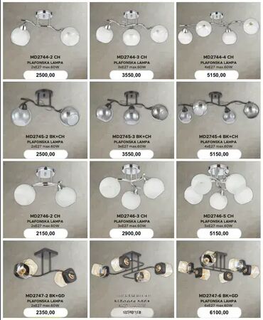 KablJačina: Max. 60W. Tip grla: 3xE27. Napon: 220-240V / 50-60Hz. Boja: Hrom. Materijal: Metal + Staklo. Dimenzije: d: 200mm š: 590mm v: 230mm. Stepen zaštite: IP20. Proizvođač: Forma. Na slikama 2 i 3 je prikazan katalog Novog uvoza sa svim modelima, ukoliko želite da poručite neki od tih modela samo nam pošaljite šifru aritkla ispod slike, cene su takodje prikazane ispod svake slike.