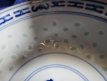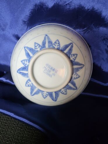 Apulina Set porcelanskih činijica – 4 komada - Materijal: porcelan (žig sa krunom na dnu) - Boja: bela sa dekorom u crvenim i zelenim linijama/tačkicama - Oblik: okrugle, blago dublje posudice - N...
