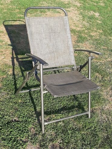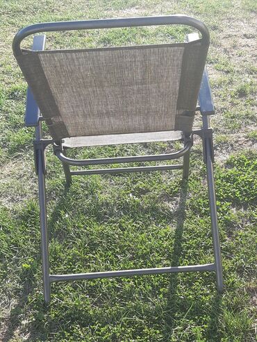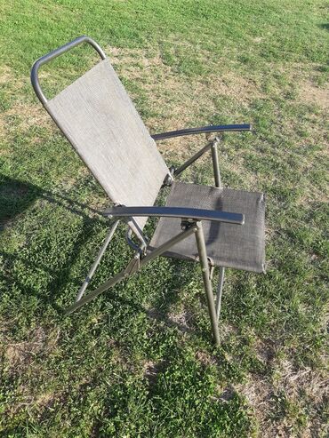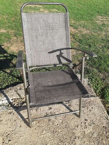 SivaMetalna stolica za dvorište,terase ili ribolov. Sklopiva je, ima dva položaja za naslon,podešavate podizanjem naslona za ruke. Veoma čvrsta i stabilna.