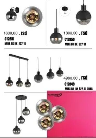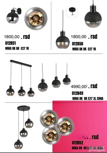 1. MIKA BK BK E27 1R – Zidni model • Cena: **1,800 RSD** • Karakteristike: Zidni reflektor sa jednim E27 grlom, moderan dizajn, crna boja sa staklenim detaljima. Idealno za akcentno osvetljenje. 2. MIKA BK BK E27 1R – Viseći model • Cena: **1,800 RSD** • Karakteristike: Minimalistički viseći luster sa jednim E27 grlom. Pogodan za manje prostore ili kao akcent u većem prostoru. 3. MIKA BK BK E27 3L CRNA – Trodimenzionalni luster • Cena: **4,990 RSD** • Karakteristike: Viseći luster sa tri svetlosne tačke, idealan za prostranije sobe. Crna boja i elegantni detalji čine ga savršenim izborom za moderan enterijer. 4. MIKA BK BK E27 3R CRNA – Stropni model sa tri svetiljke • Cena: **4,900 RSD** • Karakteristike: Plafonski luster sa tri E27 grla, ravnomerno osvetljava veće prostorije. Crna boja i stakleni dodaci daju mu sofisticiran izgled.