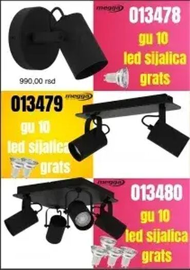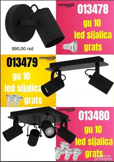 O trošku kupcaPokupiti na licu mestaNajtraženiji spotovi – CRNA boja i GU10 LED sijalice GRATIS! Osvetlite svoj dom uz najpopularnije modele spotova iz naše ponude. Izaberite savršen spoj modernog dizajna i energetske efikasnosti uz besplatne GU10 LED sijalice koje dolaze uz svaki spot! Dostupni modeli: 1. Spot – 000436 (990 RSD) • Karakteristike: Bele boje, minimalistički dizajn, idealan za montažu na zidove ili plafone. • Dimenzije: Kompaktna veličina sa podesivim uglom osvetljenja za optimalnu funkcionalnost. • Uz ovaj spot dobijate GRATIS GU10 LED sijalicu za dugotrajnu i štedljivu upotrebu. 2. Dvostruki Spot – 000545 (1,800 RSD) • Karakteristike: Dvostruki svetlosni izvor u jednom telu sa podesivim uglovima, savršen za prostranije prostorije ili akcentno osvetljenje. • Dimenzije: Savremeni dizajn sa dve GU10 LED sijalice koje dolaze GRATIS! 3. Trodimenzionalni Spot – 000682 (3,480 RSD) • Karakteristike: Trodimenzionalni plafonski spot sa tri podesive svetlosne tačke, idealan za postavljanje u dnevne sobe, trpezarije ili hodnike. • Dimenzije: Robustna konstrukcija, uz GRATIS tri GU10 LED sijalice za dodatnu vrednost. Prednosti spotova: • Energetska efikasnost: Besplatne GU10 LED sijalice pomažu u uštedi energije. • Dugotrajnost: Proizvodi napravljeni od kvalitetnih materijala za dug vek trajanja. • Moderan dizajn: Idealno za svaki dom ili poslovni prostor koji traži elegantno osvetljenje. Poručite odmah i obezbedite sebi vrhunsko osvetljenje uz GRATIS LED sijalice! Cena dostave na teritoriji Srbije varira u zavisnosti od količine. Za veće porudžbine nudimo posebne popuste!