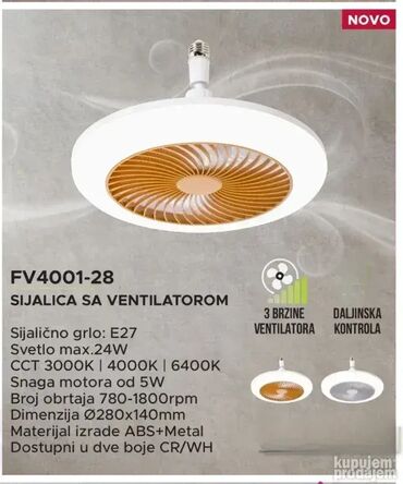 NOVO na tržištu! Revolucionarni proizvod Metalno kućište – LED sijalica sa integrisanim ventilatorom i daljinskom kontrolom! Idealan spoj osvetljenja i ventilacije za vaš dom, kancelariju, radnju ili radionicu. Kompaktno, tiho i energetski efikasno rešenje koje se jednostavno montira – kao obična sijalica! Model: FV4001-28 Tip grla: E27 (klasično grlo – lako postavljanje) Maksimalna snaga svetla: 24W Temperatura boje (CCT): 3000K (toplo), 4000K (neutralno), 6400K (hladno belo) Snaga ventilatora: 5W Brzine ventilatora: 3 (780–1800 obrtaja/min) Daljinski upravljač uključen Dimenzije: Ø280 x 140 mm Materijal: ABS plastika + metal Boje: CR (braonkasto-bakarna) i WH (bela) Cena: SAMO 1800 RSD! Osvežite prostor i uštedite na klasičnim ventilatorima – sve u jednoj sijalici! Montira se jednostavno u bilo koje standardno E27 grlo – bez dodatnih kablova i alata! IDEALNA ZA: Dnevne i radne sobe Kancelarije Terase i kuhinje Letnje kuće i radionice 2 GODINE GARANCIJE Isporuka odmah! Slanje kurirskim službama širom Srbije! Za sve dodatne informacije i porudžbine, pošaljite poruku ili pozovite odmah.