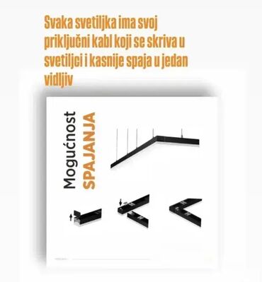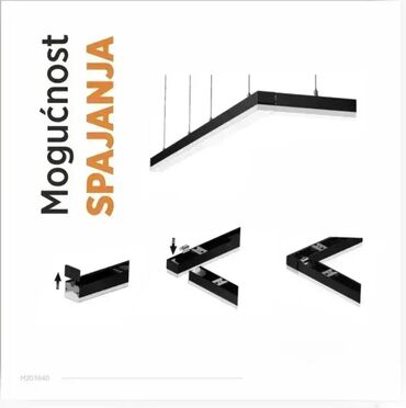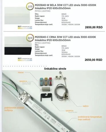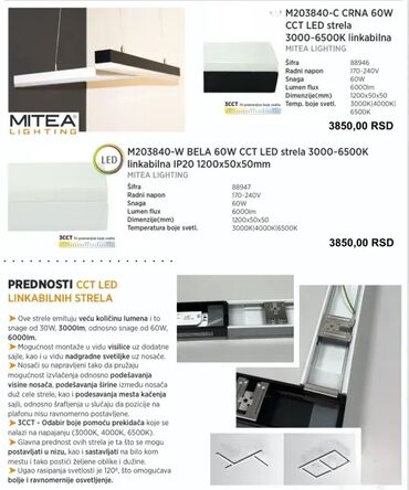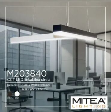 LEDOve strele emituju vecu kolicinu lumena i to snage od 30W, 3000lm, odnosno snage od 60W, 6000lm. • Mogucnost montaze u vidu visilice uz dodatne sajle, kao i u vidu nadgradne svetilike uz nosace. • Nosaci su napravijeni tako da pruzaju moguénost izvlacenja odnosno podesavanjavisine nosaca, podesavanja sirine izmedu nosaca duz cele strele, kao i podesavanja mesta kacenja sajli, odnosno srafljenja u slucaju da pozicije naplafonu nisu ravnomerno postavljene. • 3CCT - Odabir boje pomocu prekidaca koje senalazi na napajanju (3000K, 4000K, 6500K). • Glavna prednost ovih strela je ta sto se mogu postavijati u nizu, kao i sastavijati na bilo kom mestu i tako postici zeljene oblike i duzine. • Ugao rasipanja svetlosti je 120° , sto omogucava bolje i ravnomernije osvetljenje. ZA više informacija, kontaktirajte nas.