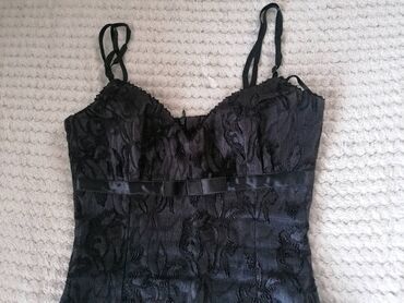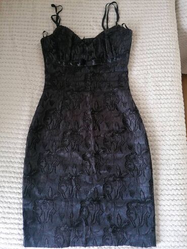 Prelepa, uska, elegantna haljina, par puta nosena u S velicini. .. .Na samoj haljini su kao navezeni cvetovi od nekog crnog sjajnog konca. Malo iznad kolena je duzina