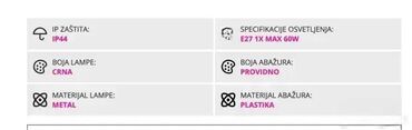 Kategorija: Spoljna rasvetaTip: Spoljna zidna rasvetaStil lampe: StandardnaPreporučena prostorija za korišćenje terasa, zid kućeIP zaštita: IP44Boja lampe: crnaMaterijal lampe: metalBoja: abažura providnoMaterijal abažura: plastikaBroj grla: 1Vrsta grla: E27Specifikacije osvetljenja: E27 1x MAX 60WPrimenjena voltaža230V, 50HzUdaljenost od zida: 193.0Horizontalno (mm): 170.0Vertikalno (mm): 230.0Jedinstvena veličina kutije: X (cm)20.6Jedinstvena veličina kutije: Y (cm)18.0Jedinstvena veličina kutije : Z (cm)23.7Neto težina: (kg)0.55Bruto težina: 0.72Wi-FineKlasa zaštite: I
