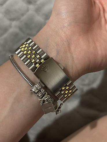 Narukvica čelično–zlatna (dvo-ton), u stilu jubilarnog/link dizajna, sa preklopnom kopčom sa reljefnim logom krune. Kombinacija poliranih i brušenih površina na kućištu i narukvici.