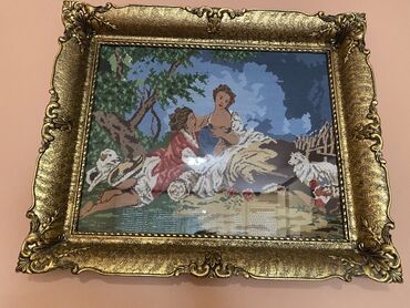 Ručno rađene goblene u bogatim pozlaćenim ramovima Opis: - Set od dva velika goblena, pažljivo izrađena sitnim bodom. - Motiv 1: Pastoralna scena – devojka pored izvora, prirodni pejzaž sa stenama...