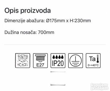 Šifra: 118364 Brend: MITEA Lighting Artikal: Viseća lampa Tip grla: E27 Broj grla: 3 Ready for LED: DA Boja: Crna Radni napon: 220~240V Izvor svetla:3 x max.60W Sij. uključene uz proizvo. : NE IP zaštita: IP20 Stepen električne zaštit. : I klasa Temperatura okoline:0~ +40 ° C Način montaže: Na plafon Dimenzije abažura: Ø175mm x H:230mm Dužina nosača: 700mm
