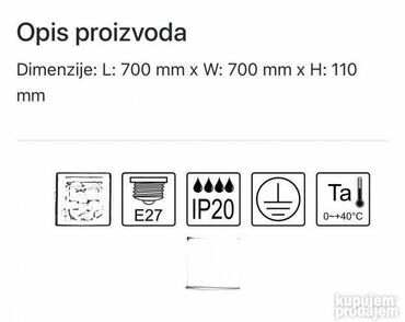 KablŠifra:110428 Brend: MITEA Lighting Artikal: Luster Tip grla: E27 Broj grla: 9 Ready for LED: DA Boja: Bela Radni napon: 220~240V Izvor svetla: 9 x max. 60W Sij. uključene uz proizvo. : NE IP zaštita: IP20 Stepen električne zaštit. : I klasa Temperatura okoline:0~ +40 ° C Način montaže: Na plafon Dimenzije: L: 700 mm x W: 700 mm x H: 110 mm