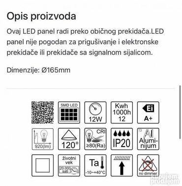 Specifikacija : Snaga : 24WEkvivalent klasicnoj sijalici : 120WLumen (jačina svetlosti) : 2100lmNapon : 220-240VUgao osvetljenja : 120° Boja svetlosti : 6400K Hladno-belaOblik : KvadratniMaterijal ...