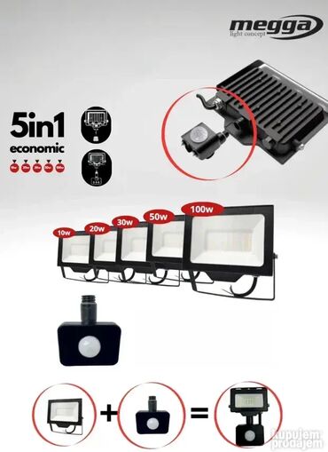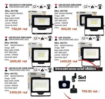 U ponudi NOVA serija **5in1 Economic Reflekotra** koji mogu biti sa ili bez senzora jednostavnom monažom sa **2 GODINE GARANCIJE.** Cena Univerzalnog senzora za led reflekotre je **700,00 rsd** po komadu. Led reflektori su crne boje, odličnog kvaliteta sa **LED čipom oznake SMD 2835** , svi led reflektori su **6500k** , hladno bele boje svetla, materijal reflektora je **metal i staklo** , sa zaštitom za **spoljne uslove**. Takodje reflektori poseduju zaštitu na udarce. Za više informacija budite slobodni da nas pozovete i pišete nam, pogledajte i nas KP IZLOG, nudimo preko **3500 artikala** , led rasvete, dekorativne rasvete, po najpovoljnijim cenama u Srbiji.