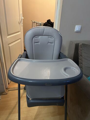 - Dečija hranilica sa poslužavnikom. Stabilna metalna konstrukcija tamnosive boje, sedište i naslon presvučeni mekanim, lako održivim materijalom u sivoj boji. Poslužavnik sa udubljenjem za čašu/šolju, može se skinuti radi čišćenja. Naslon za noge, sigurnosni pojas, široka baza za bolju stabilnost. Pogodna za bebe i malu decu tokom obroka i aktivnosti.