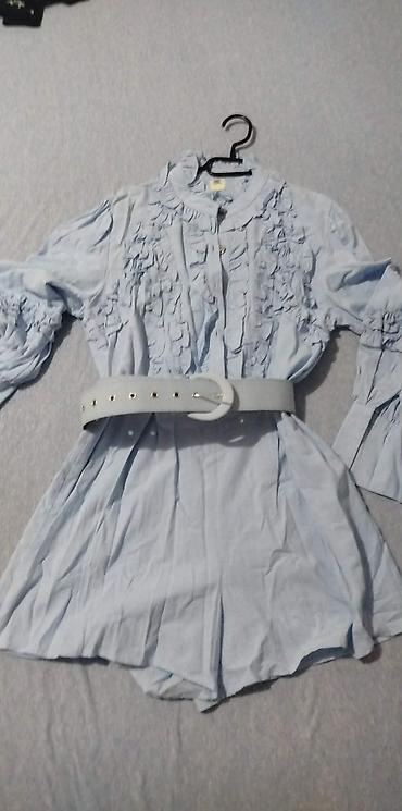 Plava ženska košulja-šorc kombinizon sa volanima i kaišem