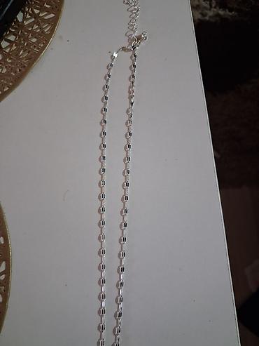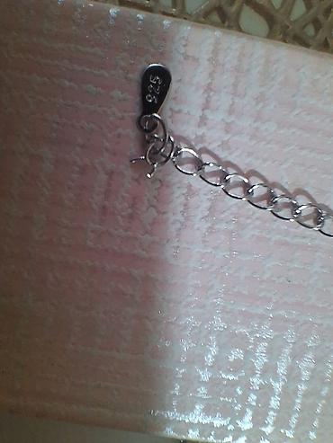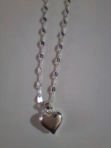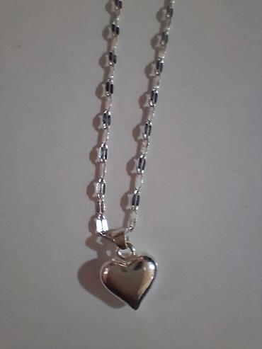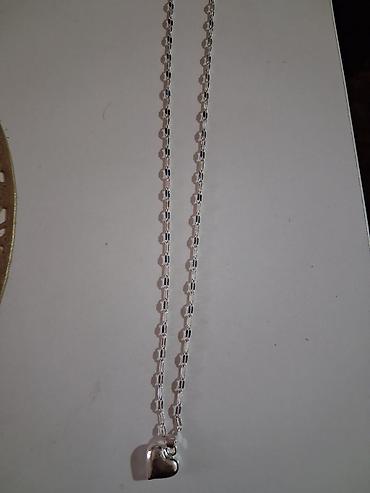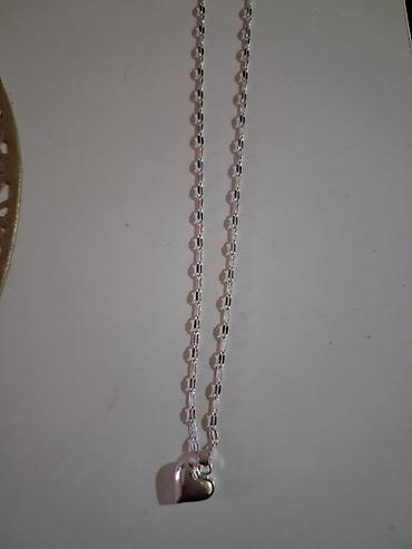 Ogrlica srebrne boje sa priveskom u obliku srca. Lanac je izrađen od