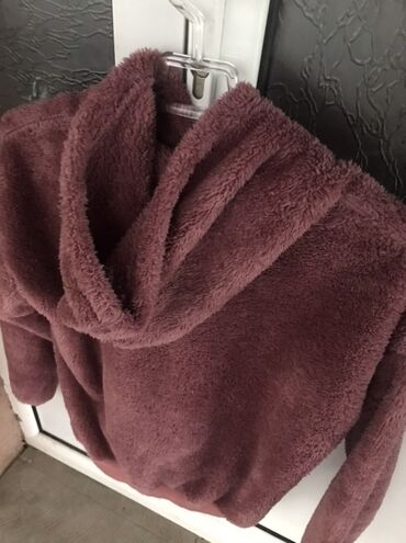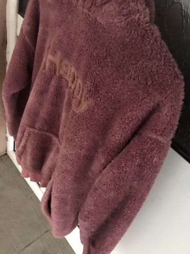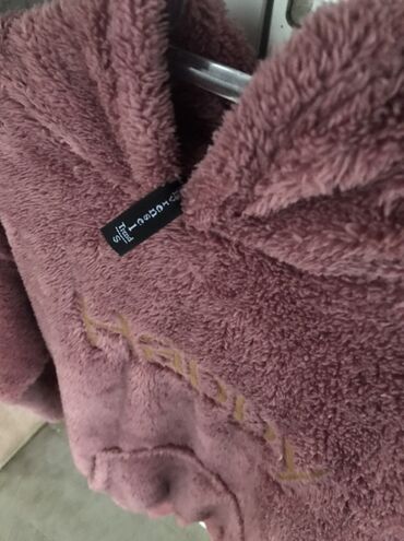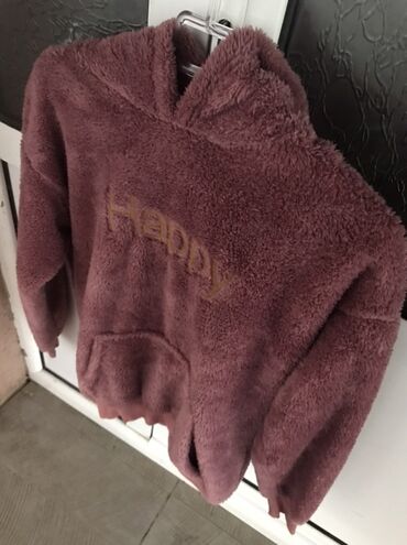 Plišani dukser sa kapuljačom – boja praškasto ljubičasta/bordo. Mekan “teddy” materijal, izuzetno topao i prijatan na dodir. Napred izvezen natpis “Happy”. Klokan džep sprijeda za ruke ili sitnice. Rebrasti porub na dnu. Model sa dugim rukavima i dubokom kapuljačom.