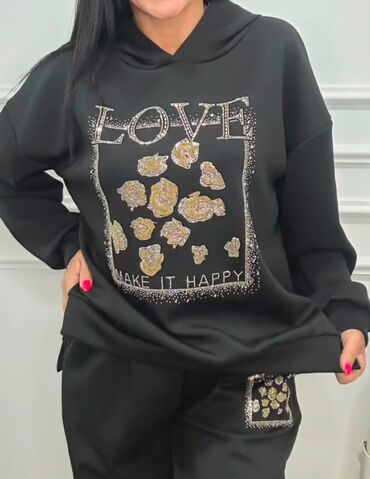 - Gornji deo: duks sa kapuljačom, opušten kroj sa spuštenim ramenima. Na prednjem delu veliki print sa natpisom LOVE i zlatnim/leopard detaljima ukrašenim sitnim sjajnim aplikacijama, ispod natpis “MAKE IT HAPPY”.