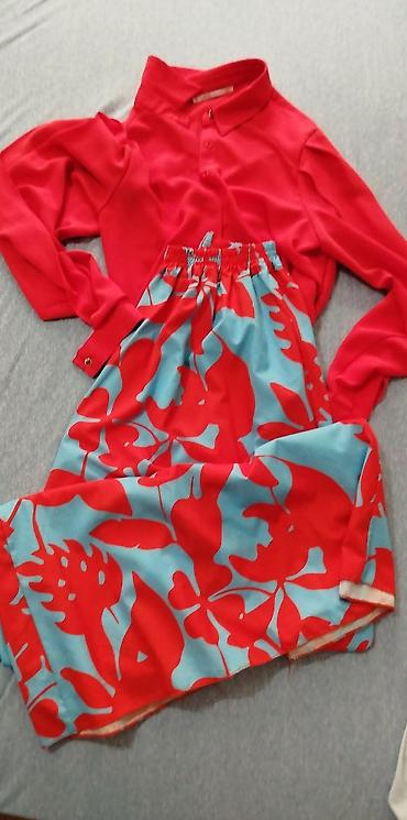 Kombinacija je vizuelno usklađena – jednobojna košulja naglašava upečatljiv dezen suknje, pogodna za letnje i poluformalne prilike. Veličina košulje 42; suknja sa rastegljivim pojasom prilagodljivog obima.