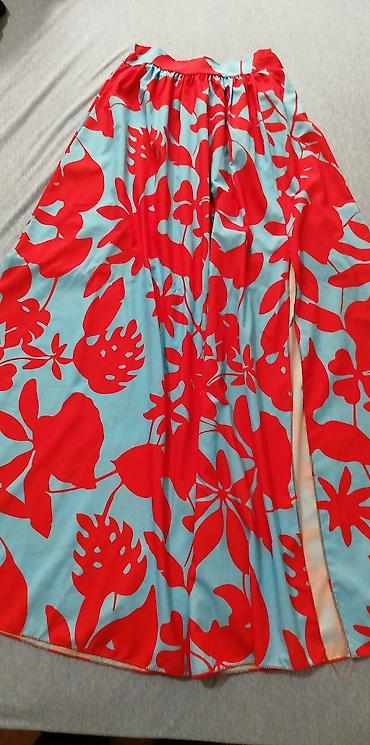 - Suknja: midi dužina sa punim A-krojem. Elastični struk za udobno pristajanje. Tkanina sa efektimskim printom velikih tropskih cvetnih i lisnatih motiva u kombinaciji svetloplave podloge i crvenih šara. Diskretno prošiven porub.