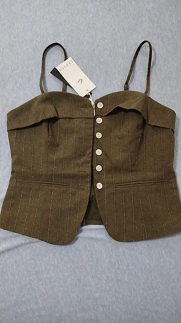 - Gornji deo: krojeni prsluk‑top sa tankim brete lama, kopčanje niz sredinu sa svetlim dugmadima, ukrasni paspuli‑džepovi sprijeda, blago zaobljen donji rub. Na etiketi piše “LAVISH”.