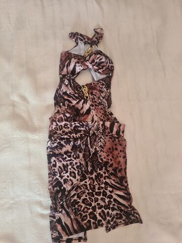 2) Jednodelna haljina sa izraženim animal printom u braon tonovima, ukrasne zlatne aplikacije napred, otvori/rezovi na predelu grudi i struka, vezivanje oko vrata.