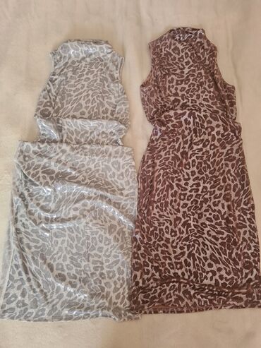 1) Dve uske haljine bez rukava sa rol-kragnom, rastegljivi materijal, sjajni/leopard uzorak. Jedna u svetlo-sivoj nijansi, druga u braon/bež nijansi. Dužina do ispod kolena.
