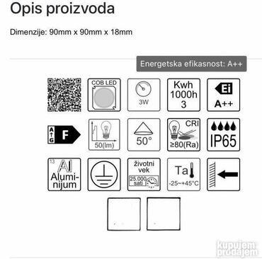 BelaZidna nadgradna kvadratna 3w 4000k vise boja. Brend: MITEA Lighting. Artikal: Zidna lampa. LED: COB. Oblik: Kvadratni. Boja: Bela. Radni napon: 220~240V. Snaga (procenjena): 3W. Potrošnja elek. energije: 3 Kwh/ 1000h. Energetska efikasnost: A++. Energetska efikasnost 2019.: F. Lumen flux (nom.): 50 (lm). Lumen without cover: 300 (lm). Temp. boje svetl.: 4000 K (Cool white). Ugao rasipanja svetlosti: 50º. CRI - indeks reprodukcije: ≥80(Ra). IP zaštita: IP65. Materijal: Aluminijum (Al). Stepen električne zaštit.: I klasa. Životni vek: 25.000 h na 25° C. Temperatura okoline: -25~ +45 ° C. Način montaže: Na zid. Dimabilnost: Ne. ON-OFF ciklus prekida: 25.000 X. Integrisani LED: DA. Dimenzije: 90mm x 90mm x 18mm.