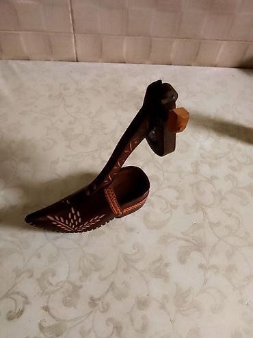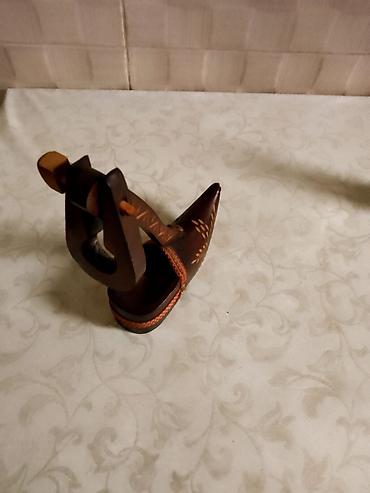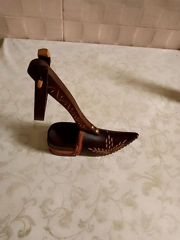 - Ručno rađen drveni suvenir u formi tradicionalne opanke, sa ukrasnim rezbarijama i pletenim detaljima.