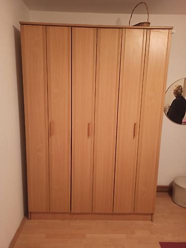 Plakar od medijapana/iverice u boji svetlog drveta (bukva). Klasičan, funkcionalan model sa četvoro krila i vertikalnim ručkama u istoj nijansi. Ravan gornji poklopac omogućava odlaganje sitnica odozgo. Donji sokl je zatvoren radi urednog izgleda.