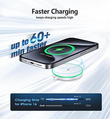 - Brže punjenje: optimizovan GaN čip održava visoke brzine punjenja; u testovima na iPhone 16 pokazano do 60+ minuta brže do punog kapaciteta u odnosu na standardno rešenje (prikazano 88% naspram 55% u istom vremenu).