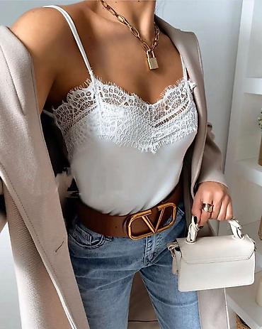 Beli ženski satenski top na bretele - Materijal: glatka, svilenkasta tkanina sa diskretnim sjajem (saten/viskoza). - Kroj: ravna silueta, V-izrez napred i pozadi. - Detalji: romantična čipka duž d...