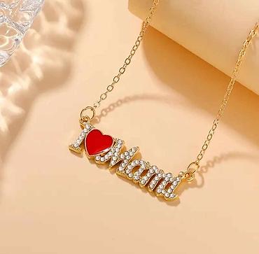- Dizajn: zlatno-tonirana baza; natpis “Mom” ukrašen sitnim svetlucavim kamenčićima, crveno srce kao akcent; klasičan lančić sa ovalnim karikama.
