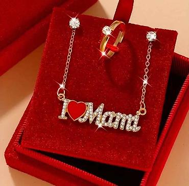 - Sastav kompleta: ogrlica sa privjeskom “I ❤ Mom”, par minđuša (klinovi) i prsten.