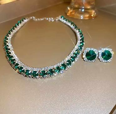 - Minđuše u paru: okrugli zeleni centralni kamen u pavé okviru od sitnih prozirnih kamenčića, tipa „stud“.