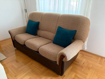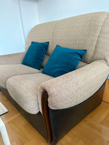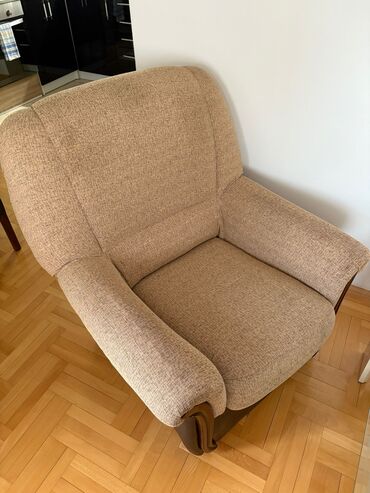 - Tapacirung: svetlo-bež štof sa diskretnom teksturom, udobni debeli jastuci sedišta i segmentisani naslon za dodatnu potporu leđa