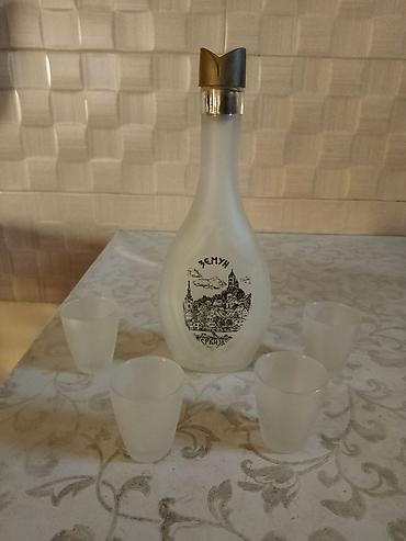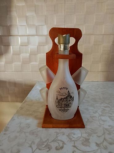 - Komplet sadrži: 1 staklenu bocu sa čepom i 4 čokanjčića (frostirano staklo), plus drveni stalak.