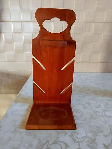 - Drveni stalak sa urezima predviđen je za odlaganje četiri čokanjčića sa strane i boce u centru; ima ručku/otvor pri vrhu radi lakšeg pomeranja.