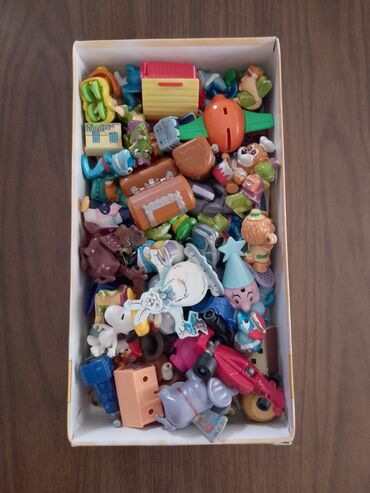 - Raznovrstan set malih plastičnih figurica, minijaturnih vozila, životinja, likova iz crtanih filmova, nalepnica/kartonskih isečaka i dodataka za igru.