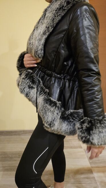 - Materijal: crna eko-koža sa bogatim krznenim detaljima u sivo-crnoj nijansi (kragna, ranfle na rukavima i donji rub).