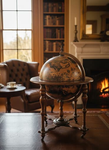 Dekorativni globus sa postoljem od drveta, idealan za uređenje enterijera. Globus prikazuje mapu sveta sa istorijskim elementima, dok se postolje sastoji od četiri izrezbarena drvena stuba i baze s...