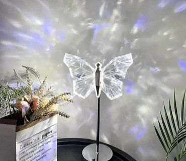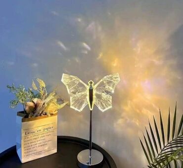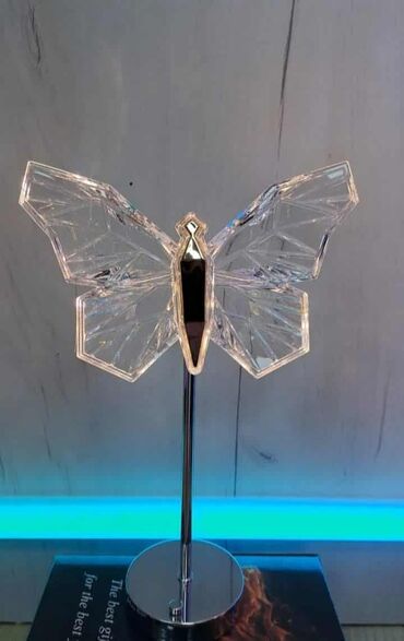 - Elegantna lampa u obliku leptira od providnog, facetiranog akrila/kristalnog efekta koji prelama svetlost i stvara dekorativne refleksije na zidu.