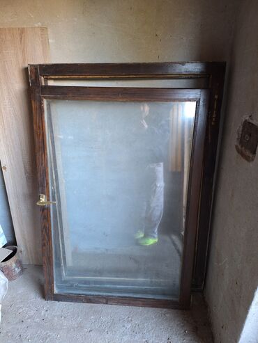 - Materijal: drveni ram u tamnoj boji (imitacija oraha), staklo jednostruko/dvostruko (vidljivo veliko krilo sa ručkom)