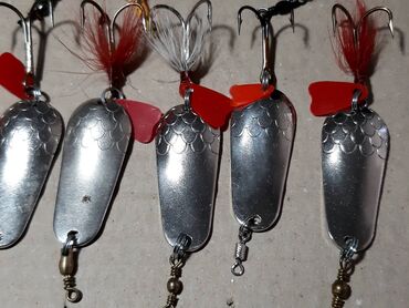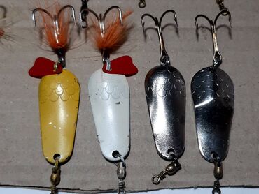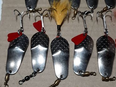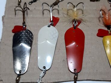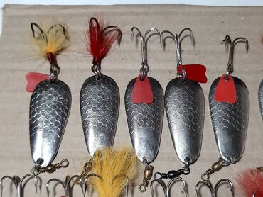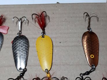 Prvi red od gore: ukupna tezina jedne varalice je oko 11grama, duzina same kasike je oko 47mm, na kasikama je otisnuto sa jedne strane krljust ribe a sa druge inicijali proizvodjaca, cena je za srebrne i zutu je 400din po komadu a za onu bakarne boje 480din -odlicno ocuvane, nisu koriscene