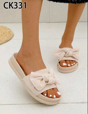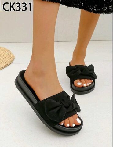 - Dizajn: otvorene slip-on papuče sa širokom trakom i velikom dekorativnom mašnom.