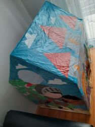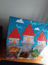 - Veliki šator za igru sa motivom dvorca: sivi zamak sa crvenim krovovima, oblacima i likovima princeze, viteza i žapca.