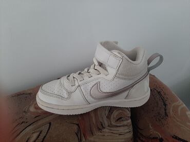 Dečje sportske patike Nike, srednje visine (mid), u svetloj bež/šampanj nijansi sa karakterističnim Swoosh logom sa strane.