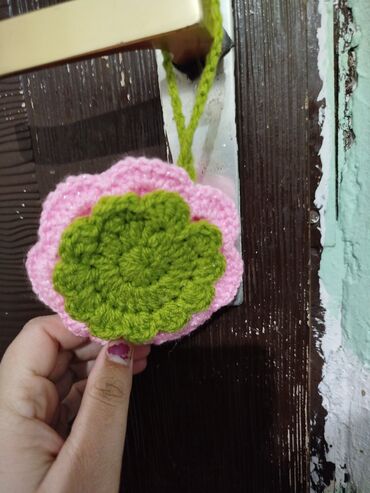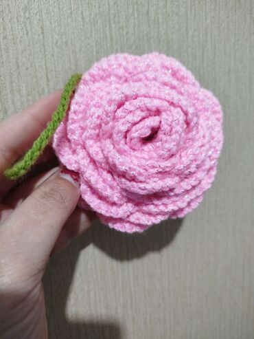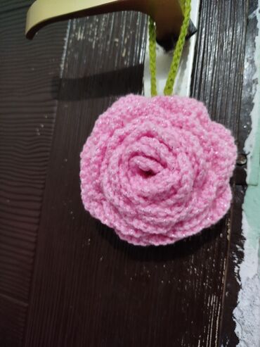 - Heklani ružini cvetovi – zasebni ukrasni elementi od ružičaste pređe sa blagim sjajem, sa zelenim listom i vezicom/alkom. Pogodni kao broš, ukras za kosu, trakicu, torbicu ili kao dodatak haljinici i dekor za vrata/komodu.