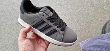Sive patike sa crnim detaljima i pertlama, casual sportskog stila. Gornjište od sintetike/tekstilnog materijala sa tri crne pruge sa strane i natpisom “CAMPS”. Jezik sa logom, crna postava i ojačan peta dio. Gumeni đon u beloj boji sa smeđom (gumi) spoljašnjom slojem za dobro prijanjanje. Klasično pertlanje kroz pet rupica sa obe strane. Niska silueta, pogodna za svakodnevno nošenje, šetnju ili lagane aktivnosti. Elegantna kombinacija sive i crne lako se uklapa uz različite odevne kombinacije.